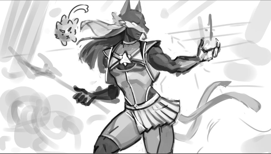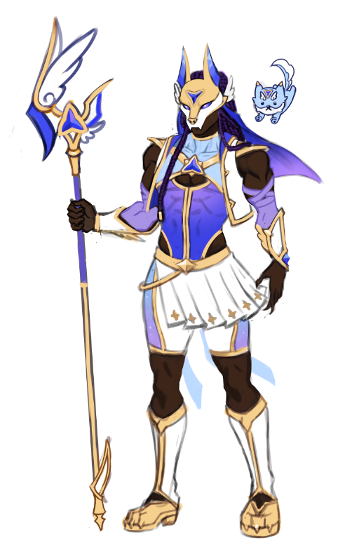 A fan skin concept for the character “Nasus” from the game League of Legends. This was made for an online fan zine based on the Star Guardian skin universe and concept inside of League of Legends. I heavily based my inspirations from other existing Star Guardian skins, whilst also trying to adjust it to fit the themes of the original character of Nasus, which was difficult as the original character of Nasus is an anthropomorphic animal. This was my first time being a part of a zine project as well as my first time drawing an “official” character turn around that was fully rendered.